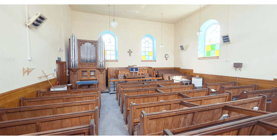 The Church (11.17m x 9m) a single room, accessed by two external doors, and an internal door to the Sunday school, with pews and organ in situ.